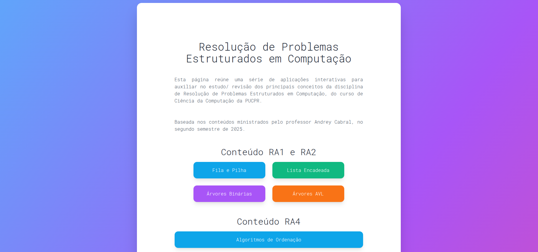 Uma série de aplicações web para estudo, contendo conteúdo, exemplos, exercícios e quizzes da disciplina Resolução de Problemas Estruturados em Computação desenvolvida enquanto monitora da disciplina.