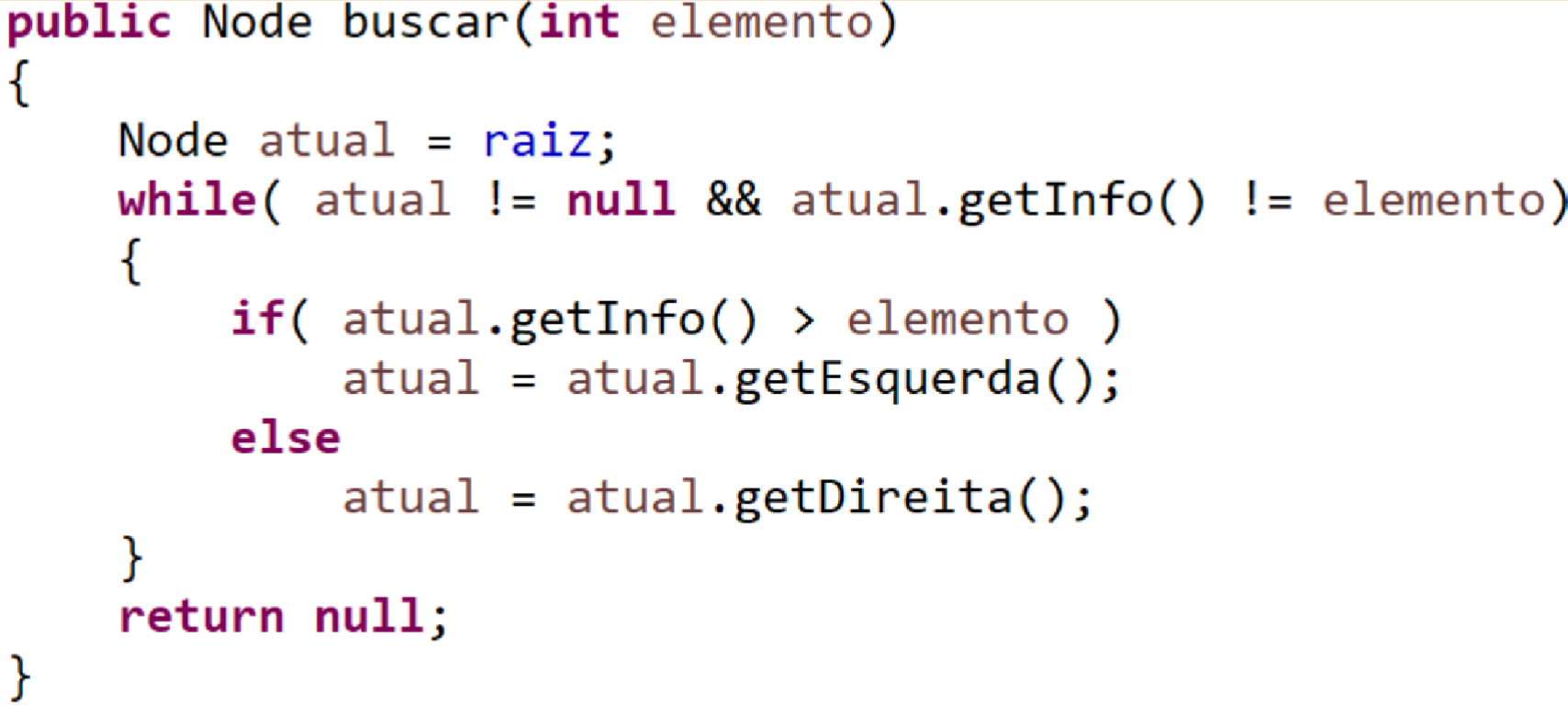 Pode-se verificar que todo filho esquerdo contém um elemento menor do que o elemento armazenado no seu pai e todo filho direito contém um elemento maior ou igual do que o elemento armazenado no seu pai. Um elemento a pode ser pesquisado em uma árvore binária utilizando-se um algoritmo de travesia como o colocado a seguir: