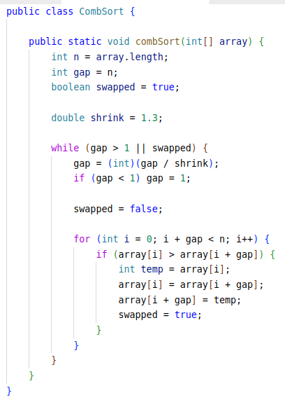 O Comb Sort é um algoritmo de comparação que melhora o Bubble Sort eliminando os valores pequenos perto do fim da lista (as "tartarugas"). Ele faz isso usando um 'gap' (intervalo) maior do que 1 entre os elementos comparados. O gap é reduzido por um fator (geralmente 1.3) a cada iteração até se tornar 1.