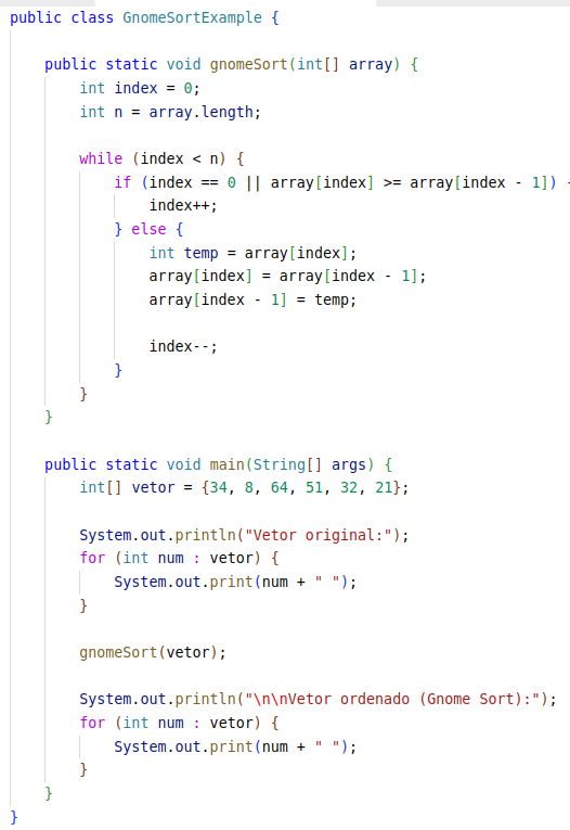 O Gnome Sort é um algoritmo simples de comparação, semelhante ao Insertion Sort, mas que evita loops aninhados explícitos. Ele funciona garantindo que o par de elementos adjacentes na posição atual esteja em ordem. Se não estiver, ele os troca e recua para verificar a ordem anterior; se estiver, ele avança.