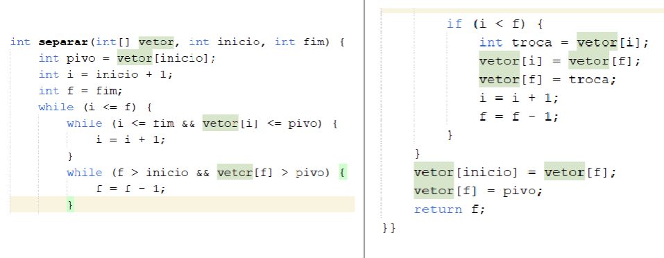 - Reorganiza o vetor: todos menores que o pivô vão para a esquerda e todos maiores para a direita.